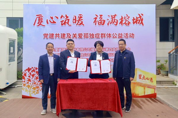 為深化銀企合作,11月11日下午,在福日電子黨委書記、董事長楊韜,黨委副書記、紀(jì)委書記陳富貴以及廈門銀行福州分行副行長鄭成輝的見證下,福日電子本部黨支部分別與廈門銀行第四黨支部、倉山分行黨支部簽訂《黨建共建協(xié)議書》,加強思想共建、促進資源共享、實現(xiàn)優(yōu)勢互補。簽約儀式后,雙方黨員代表共同走進“星點心愿”支持孤獨癥青年工作公益店,攜手開展“廈心筑暖·福滿榕城——黨建共建暨關(guān)愛孤獨癥群體公益活動”。